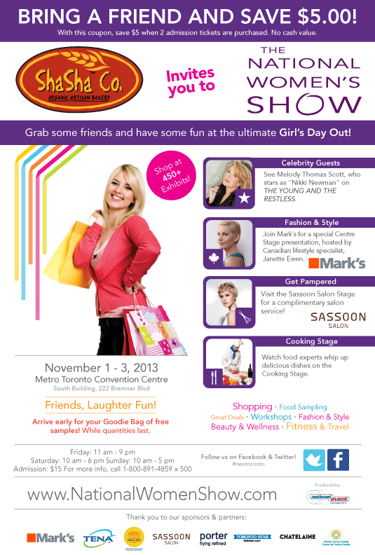 Come join ShaSha Bread Co. at the National Women’s Show located at the Metro Toronto Convention Centre on November 1, 2 & 3, 2013